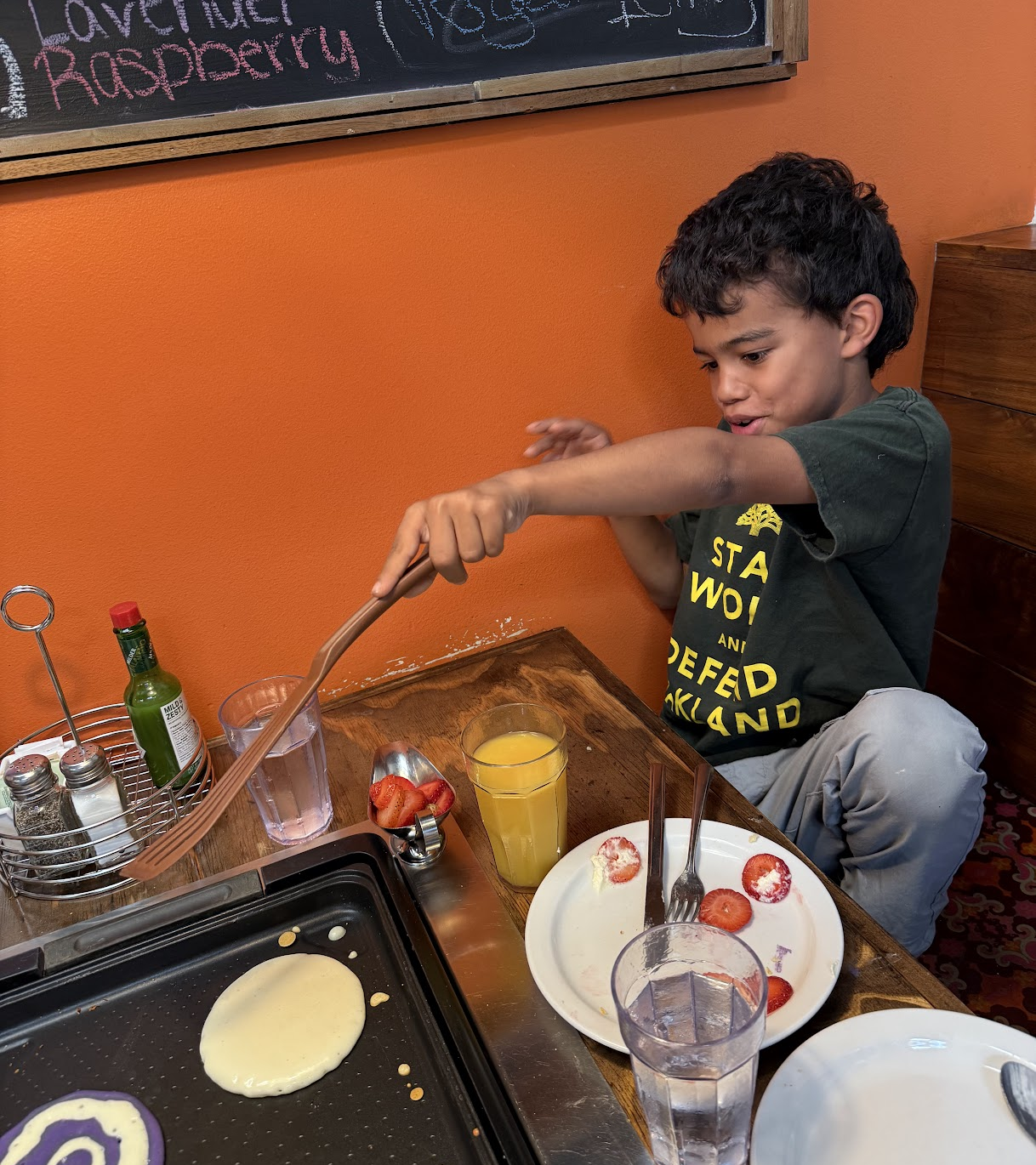 Anyway, after the long wait during which, in his own words, Arthur "almost died," we got to our table and many pancakes were cooked and consumed.